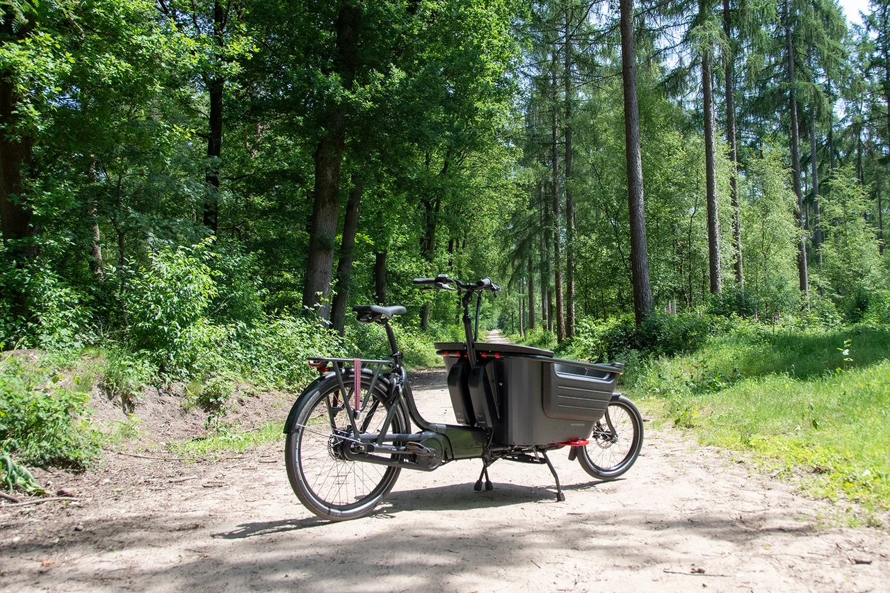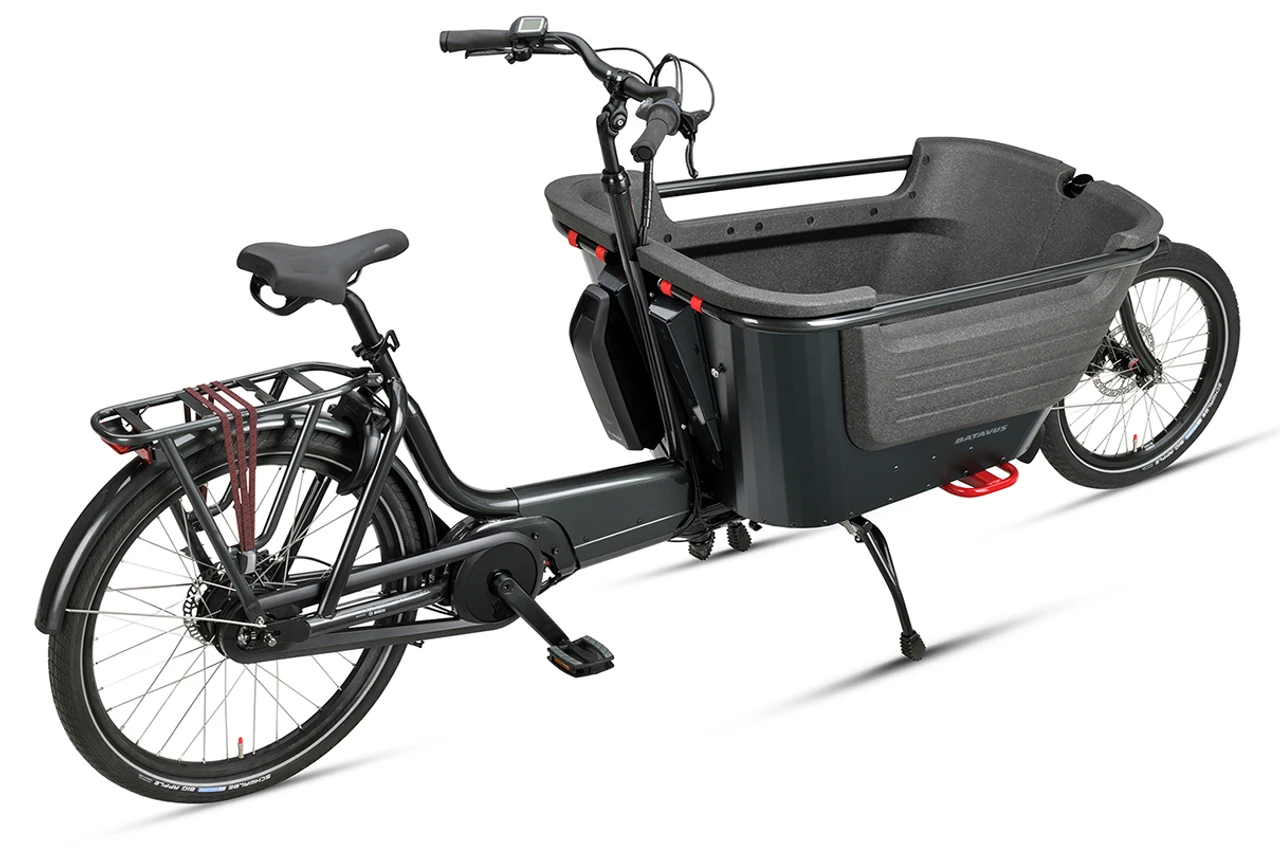 Gewicht/Overig: Tweewielige bakfiets, kunststof bak, accu-upgrade mogelijk, 5 jaar garantie op e-bike techniek