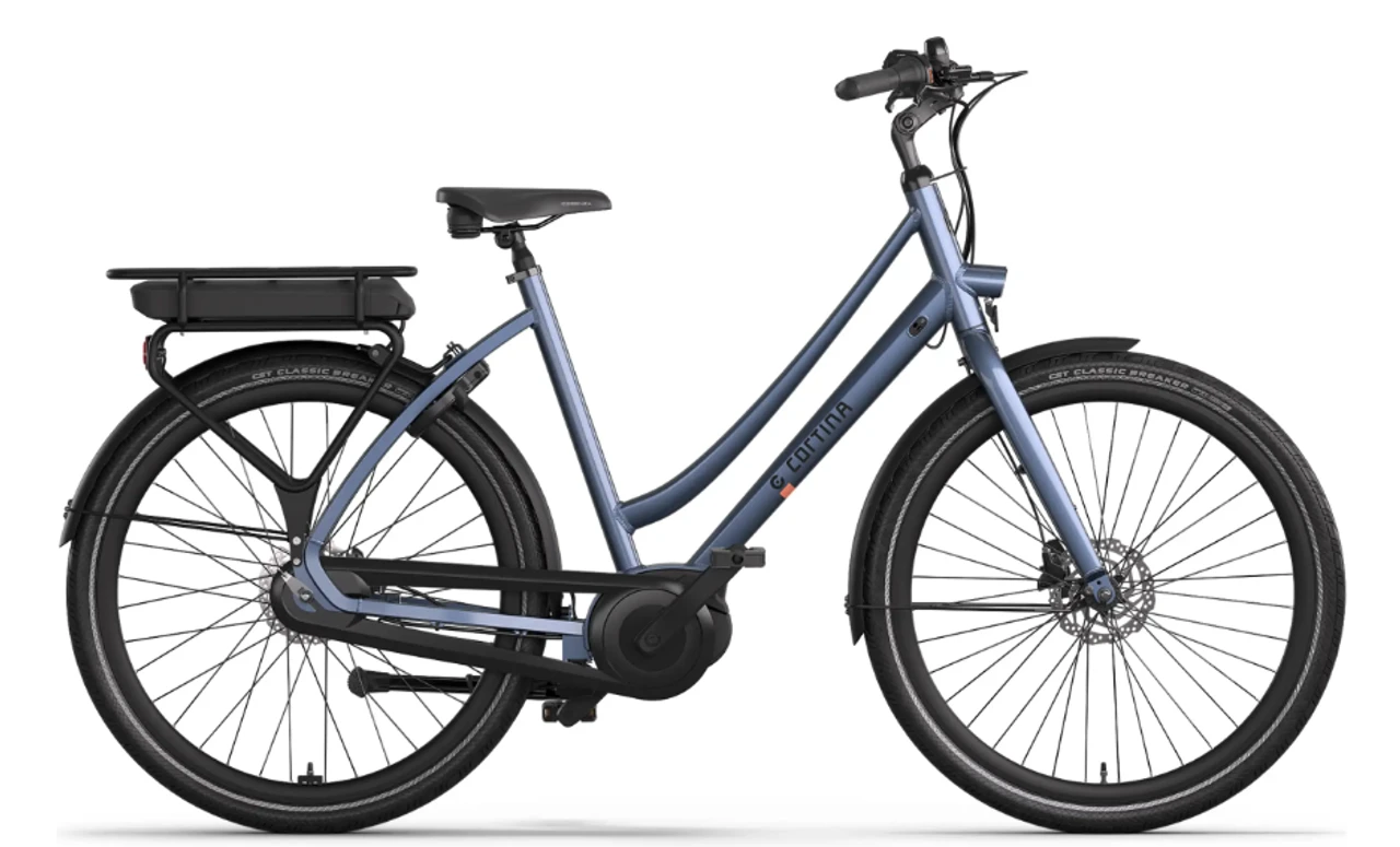 Standaard wordt de Cortina E-Tide geleverd met een 400 Wh accu op de bagagedrager, goed voor een actieradius van 50 tot 120 km. Wie vaker langere afstanden rijdt, kan kiezen voor een upgrade naar 500 Wh, waarmee de actieradius oploopt tot 60 – 140 km. De accu is uitneembaar, waardoor opladen eenvoudig blijft.